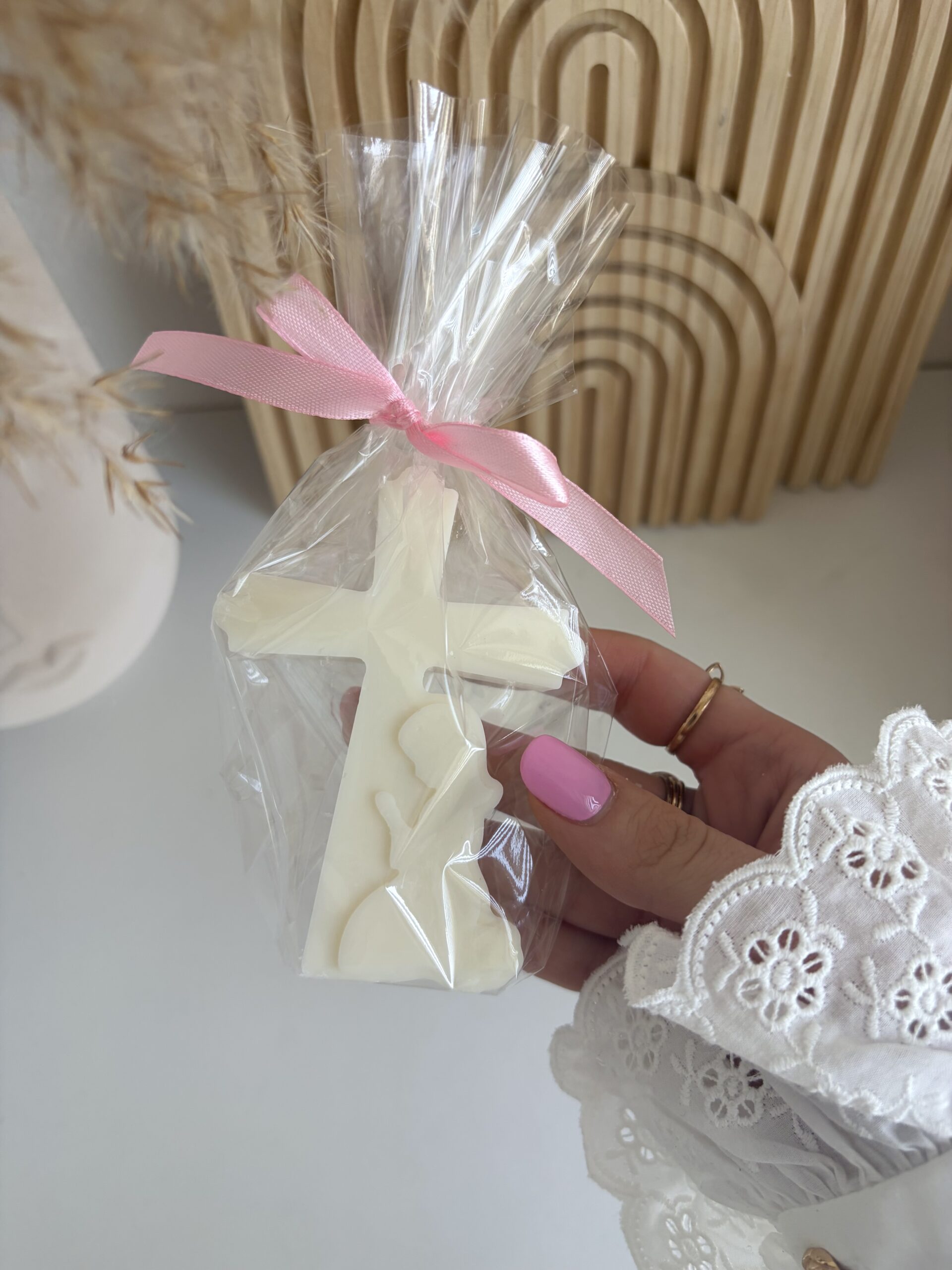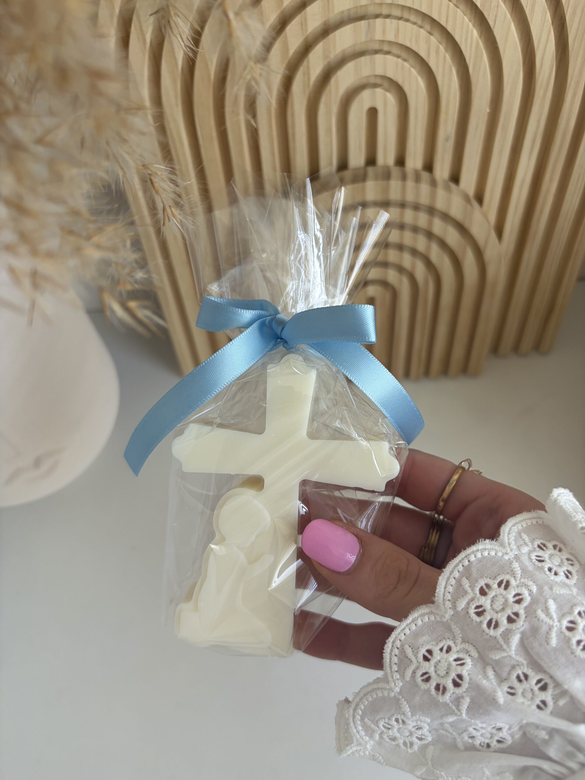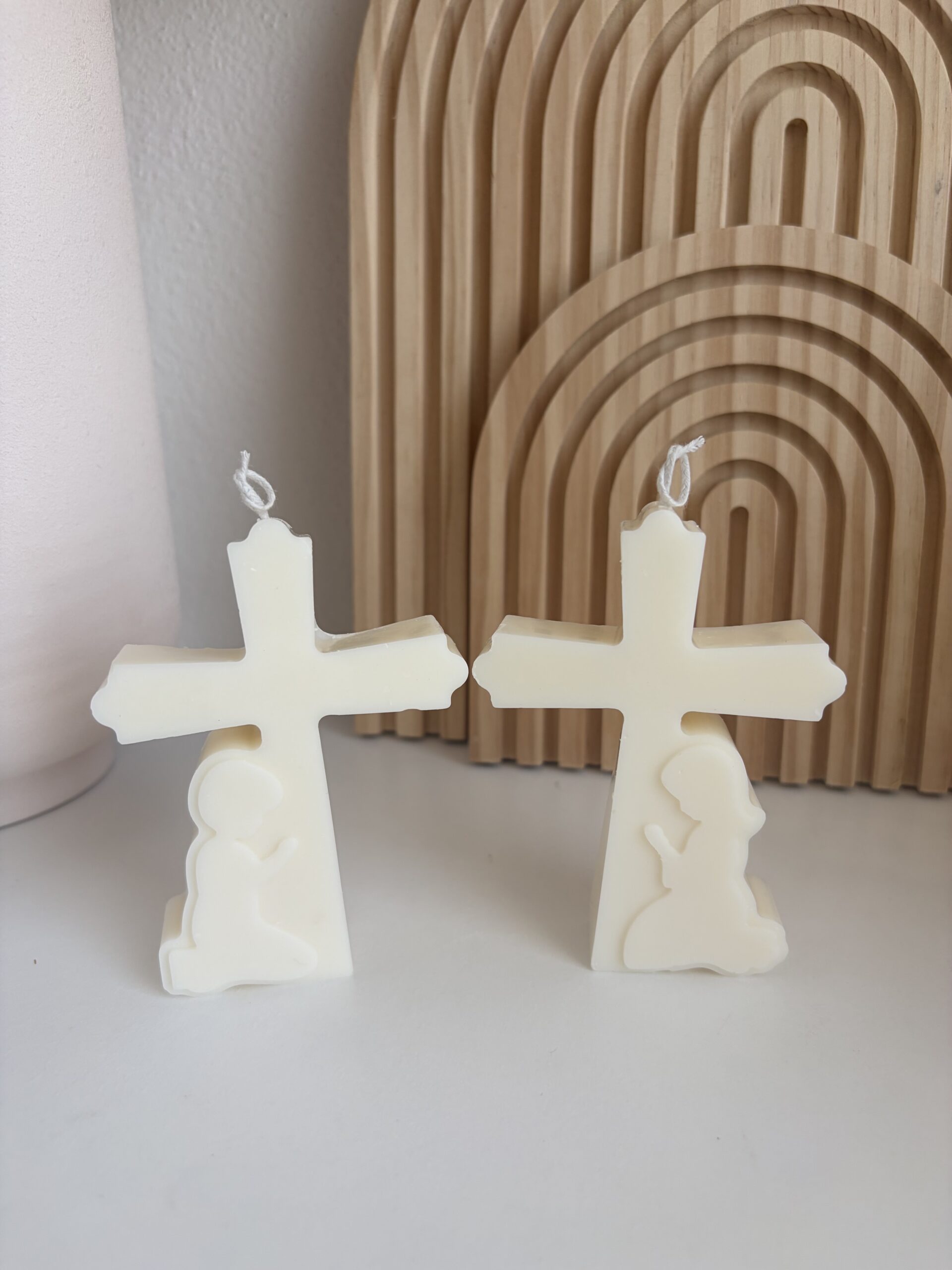 Elegantná sviečka v tvare kríža, vyrobená zo 100 % sójového vosku, je krásnym symbolickým darčekom k Svätému prijímaniu alebo birmovke. Jemný dizajn s motívom modliaceho sa dieťaťa podčiarkuje výnimočnosť a duchovný význam tohto dňa.