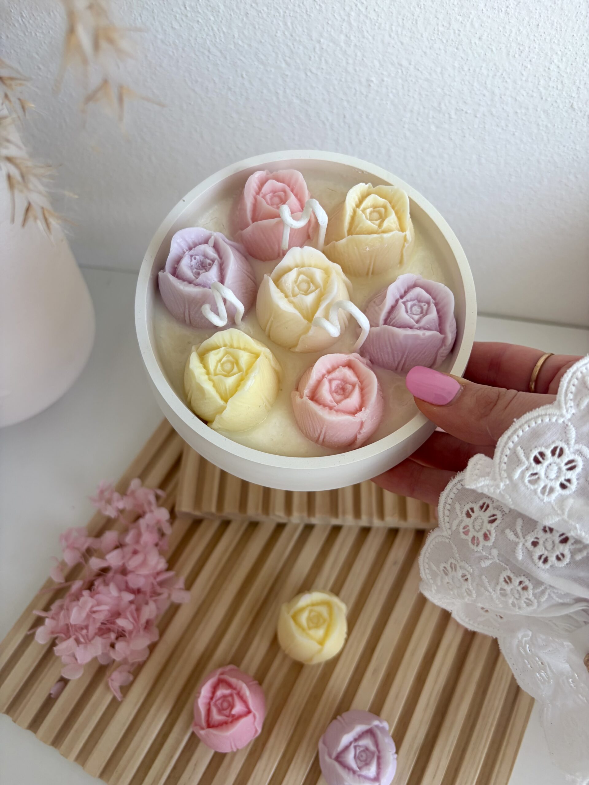 Pri prvom zapálení nechajte sviečku horieť tak dlho, aby sa vosk rozpustil po celej ploche. Vďaka tomu dosiahnete rovnomerné topenie vosku. Na okrajoch vám nezostane neroztopený vosk. Pred každým ďalším zapálením skráťte knôt na 0,5 cm. Sviečku postavte na podtácku, môžete si vybrať podtácku z našej ponuky.