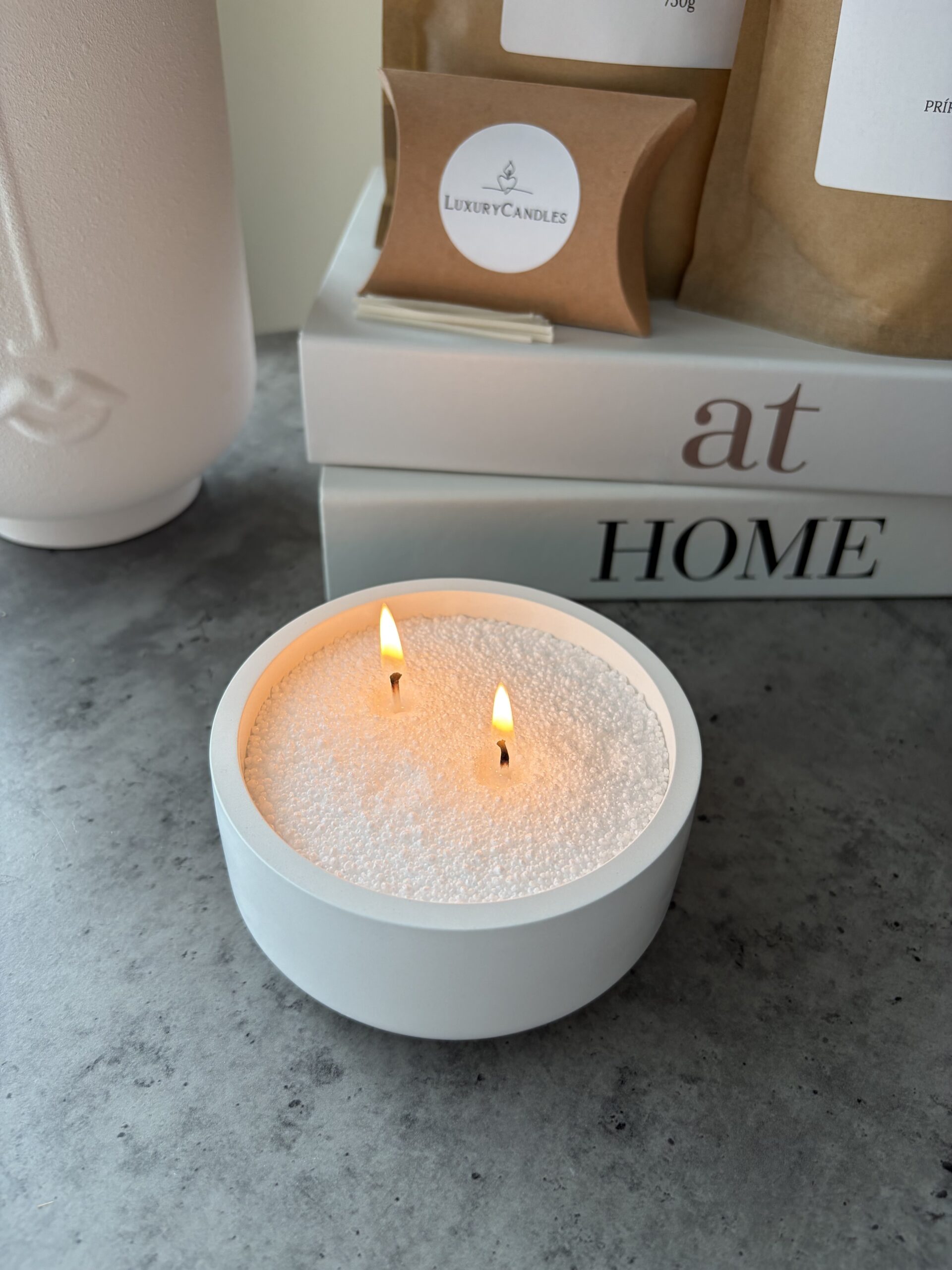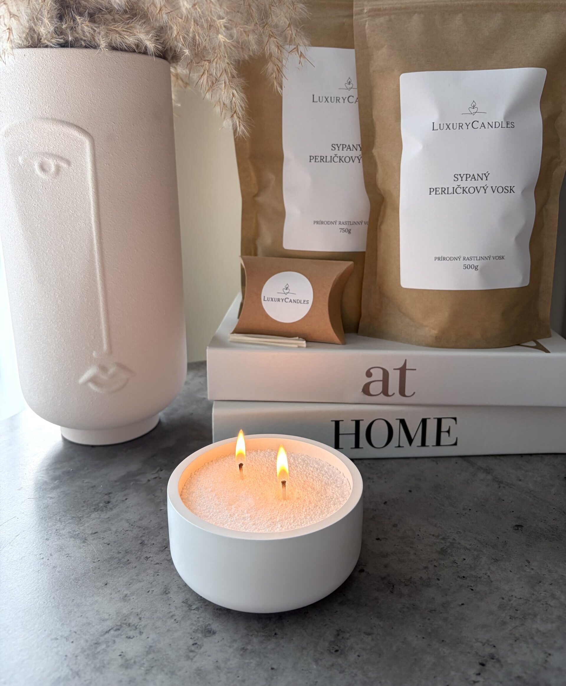 Balenie obsahuje: sypaný perličkový vosk + knôty + nádobu z ekologického materiálu Luma